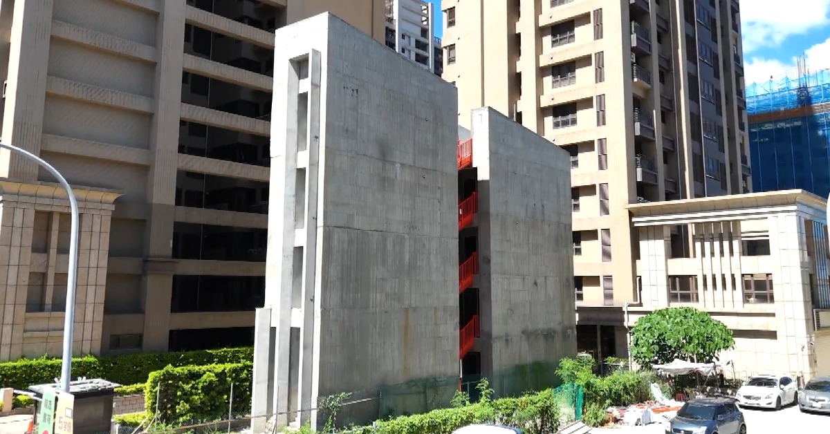 清水模結合工業風,外牆展現剛毅感,儘管有4層樓高,但跟旁邊鄰居一比,這棟建築明顯又矮又窄,透過空拍更明顯,蓋在隔壁社區大樓旁好迷你,被說是紙片屋。這棟蓋在泰山塭仔圳建物,最近掀起討論,不少人猜地主當初重劃完,不願跟建商合建分屋,現在只能蓋紙片屋。