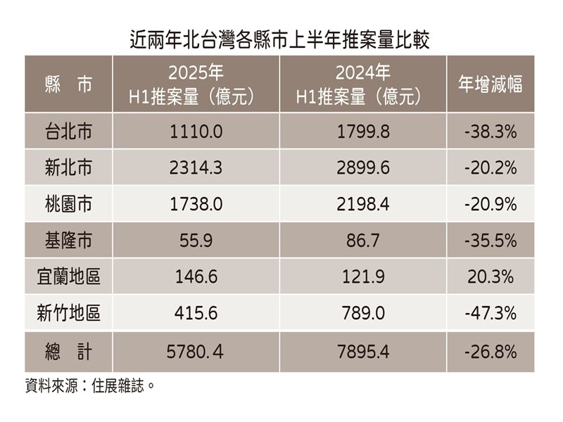 趨弱的房市讓建商不敢冒進,住展雜誌統計今年上半年北台灣新成屋、預售屋推案量,合計約5780.4億元,較去年同期減少2115億元,減幅26.8%。各縣市中僅宜蘭地區一枝獨秀有20.3%的增幅,而新竹地區、台北市衰退最多,年減幅為47.3%與38.3%。