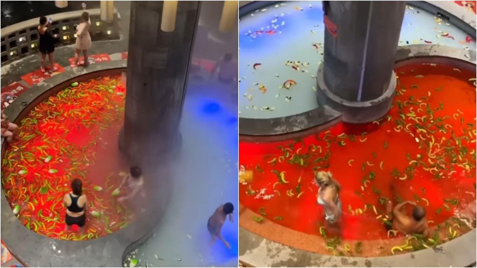 根據《TVBS》報導,1名網紅近日在IG發文,分享這間度假村的澡堂畫面,只見鴛鴦鍋造型的澡堂分成「白湯池」與「紅湯池」,裡面都放入各種辣椒,紅棗、檸檬等,看起來真的就是「火鍋湯底」。