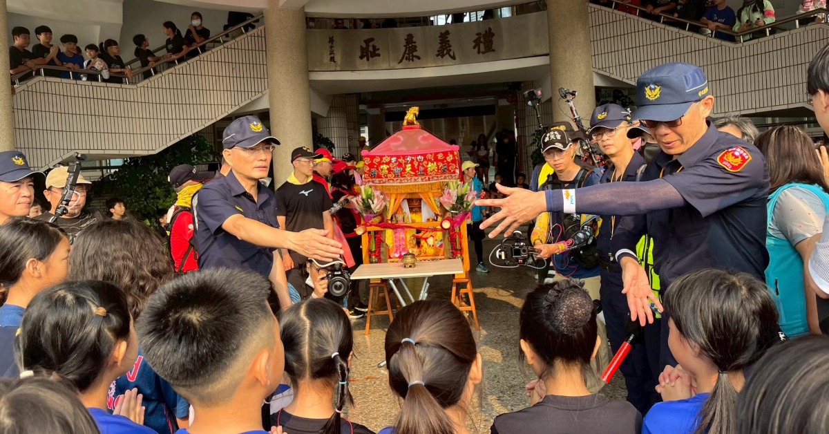 白沙屯媽祖在西螺一處幼兒園停駕,小朋友們排隊從媽祖的轎底鑽過,畫面暖心又可愛!