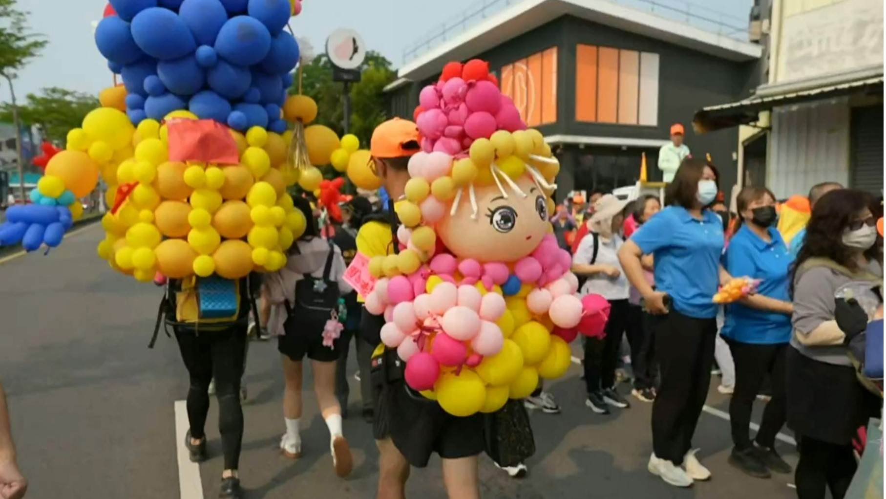 有網友揹著2公尺高的氣球媽祖,還有千里眼、順風耳一起進香。(圖/東森新聞)