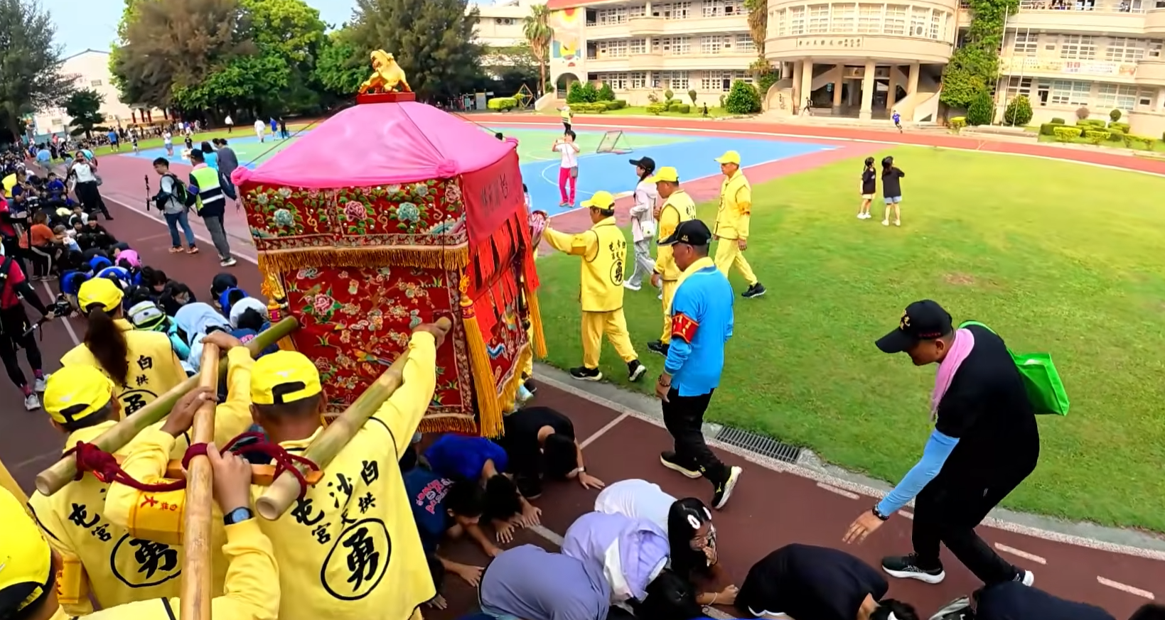 白沙屯媽祖進入田尾國小,全校師生在操場跪拜鑽轎底。(圖/白沙屯媽祖網路電視台)