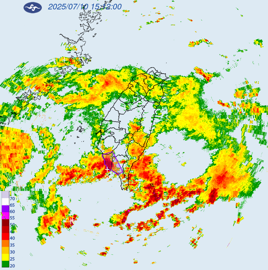 中央氣象署指出,受到低壓帶及西南風影響,易有短延時強降雨,今(10)日臺東縣(山區及大武鄉)、高雄市山區及屏東縣山區有局部大豪雨或超大豪雨,屏東縣地區有局部豪雨或大豪雨,臺南市、高雄市、臺東縣地區及蘭嶼有局部大雨或豪雨,嘉義、綠島及澎湖地區有局部大雨發生的機率;請注意雷擊、強陣風及溪水暴漲,山區嚴防坍方、落石、土石流及山洪暴發,低窪地區請慎防淹水。超大豪雨地區:高雄市、屏東縣、臺東縣。