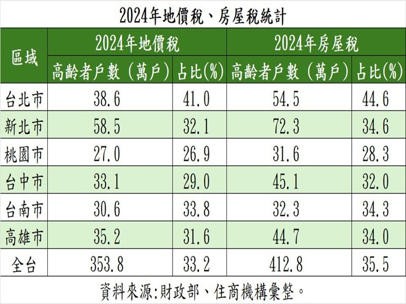 根據財政部數據,2024年房屋稅高齡納稅人達413萬戶,占全體納稅人比率35.5%創新高;其中,觀察六都數據,台北市2024年所有屋主中,有44.6%年齡超過65歲,占比冠居全台。另據地價稅統計,2024年地價稅高齡納稅人也達354萬戶,占全體納稅人比率達33.2%;其中,台北市2024年所有繳納地價稅者,也有41%的地主為高齡者,同樣占比是全台最高。