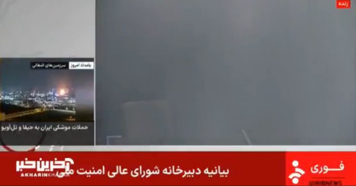 伊朗國家新聞台在16日,遭到以色列空襲,主播嚇得轉身立刻離開現場、直播被迫中斷(圖/翻攝@FaytuksNetwork)
