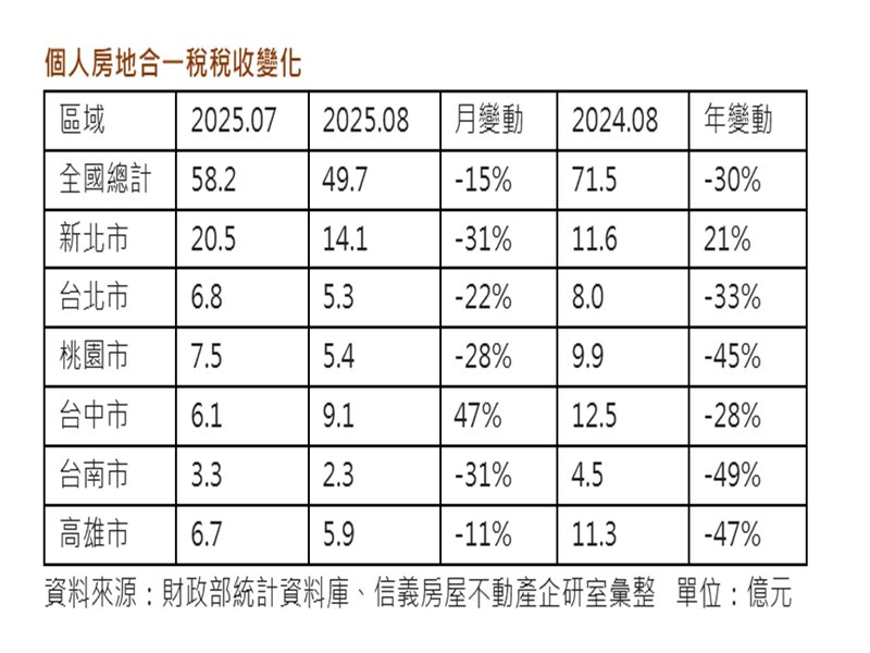 財政部最新公布統計,2025年8月全國房地合一稅收49.7億元,月減15%且年減幅度達3成,前八月全國的個人房地合一稅收金額則為345億元,受到交易量衰退影響,前八月的房地合一稅收也年減21%。