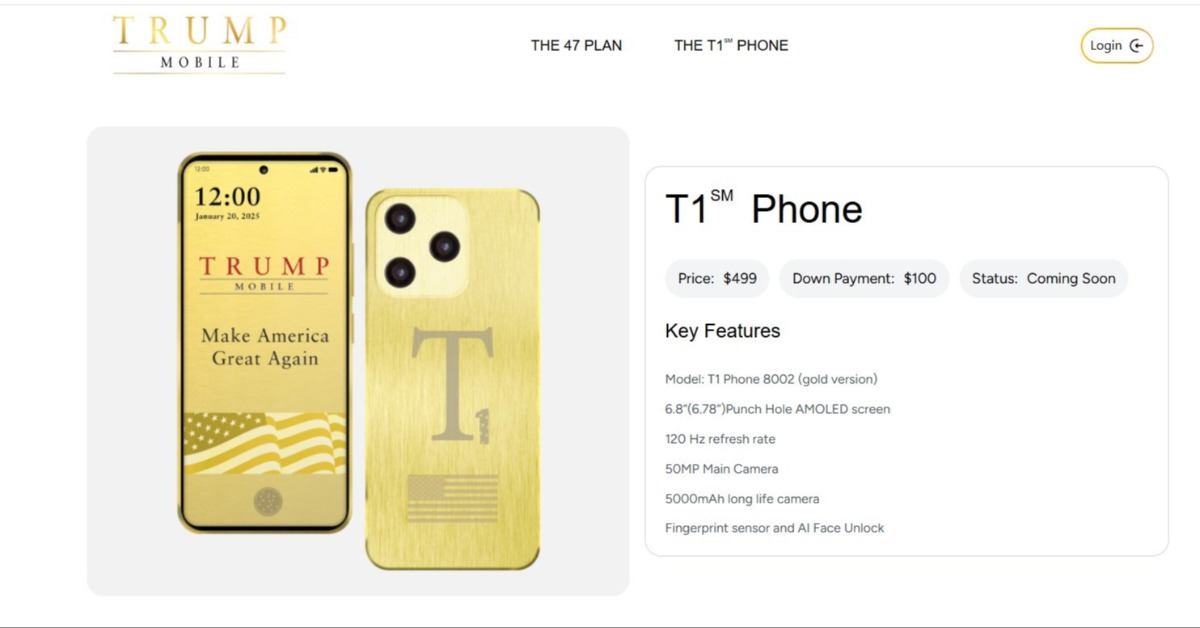 T1 Mobile同時發表Trump Mobile專屬手機「T1 Phone」,售價為499美元。該裝置搭載Android作業系統,外觀主打金色設計,宣稱由美國設計與製造。不過目前尚未公開完整硬體規格或供應商資訊。