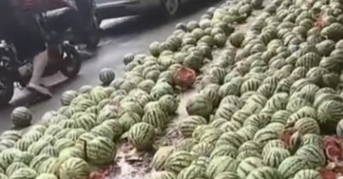 馬路上鋪滿西瓜占據車道。(圖/翻攝自 荔枝新闻 微博 )