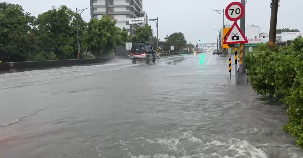台東縣各地清晨下起強降雨,市區多處路段排水不及積水。(圖/東森新聞)